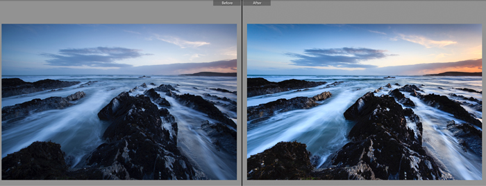 The file on the right was the result of some minor processing tweaks including lens correction, global highlights, exposure and contrast adjustments as well as an increase the vibrancy and selective sharpening (masking) being applied. You will notice that I cloned out some unwanted imprints on the sand in the immediate foreground, which were caused accidentally by me when I placed my tripod legs in the wrong place!