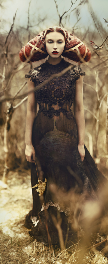 I guess my real penchant in life has always been how close I am to nature. I have found I always wanted to be right out in the thick of it, usually alone, quietly observing everything unfold within it. I grew up on really big farms, always falling asleep to aspens flapping in the wind, or a storm rolling onto our yard from the surrounding fields. The great plains were a magical place to grow up. I would say my style developed before I had equipment, when I was out in the fields and woods finding little treasures and pulling up pieces of grass. When I finally found photography, it was only natural to bring my ideas out into a natural environment, capturing some of that timeless unfolding as the backdrop to my stories. As for the aesthetic side, especially in regards to my sets, my mother was a full time antiques dealer. I grew up hearing the auctioneers mallet and playing in boxes of antiques that lined our garage and front room. She kept old original prints of Maxfield Parrish on the walls. There were old (Brian) Froud books lining the side tables. I had a perfect background to dream up a fantasy land, where a windy farm was always around me and old books always near my hands. As I got older I found the work of Arthur Rackham and John William Waterhouse and through experimentation and a lot of fun, playing and tinkering about, the rest is history.
