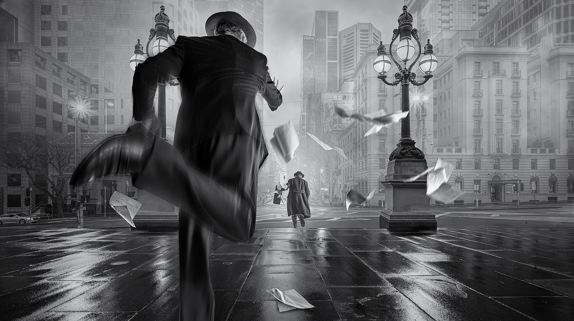 For a number of years now, my work has focussed on the ‘Lonely Man’ series. These works feature my fedora-hatted protagonist in images that tell stories of mystery and intrigue, or isolation and alienation. I try to achieve the look of a film noir movie still, emphasizing moody lighting and a sense of drama. My early works were essentially street photography captures; however, I would use post-processing to achieve a surreal other-worldly look to them. Over time, I realized that I could achieve more creativity and storytelling potential via the use of composite photography. So I began capturing figures in my home studio, where I could control the lighting and the poses and also have the capacity to place the figures in the scene where I wanted them.