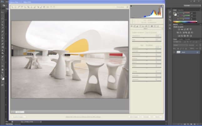 Once I arrived at the Niemeyer, I walked around to find a suitable location. I was constantly sketching pictures in my mind every step I took through that magical place. After a while I stumbled across the perfect spot to photograph. It was next to the cafeteria, and the chairs and tables formed curved lines that blended in beautifully with the rest of the wavy, undulating architecture surrounding them. Of course this was the place! I wanted to give the photograph a more urban quality, though, and to do that I needed some people. Fortunately I found two tourists who were sitting and having coffee in the cafeteria, and I explained my idea to them. They kindly agreed to participate.